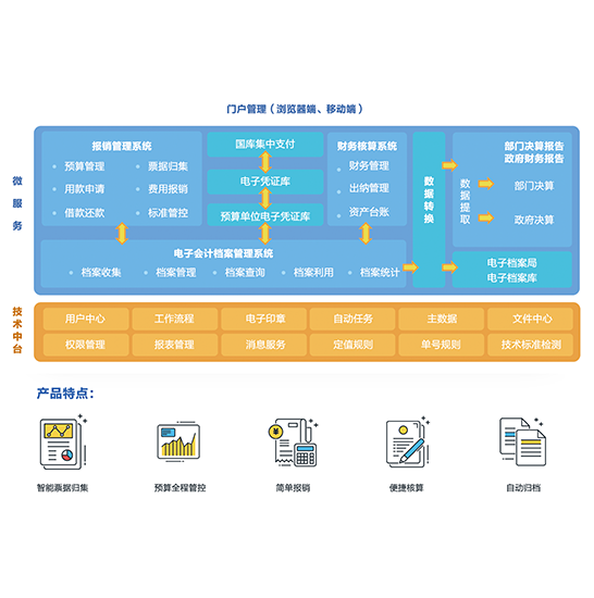 电子化报销入账归档产品解决方案,是面向各行政事业单位提供的综合财务数字化产品解决方案。方案以华体会体育官方在线官网技术中台为底座,云架构、微服务、多租户为架构,通过整合自身票据归集、电子化报销、云财务和电子会计电子档案等产品,无缝贯通各业务环节,实现票据归集、预算管控、报销办理、凭证入账、档案归档全流程网上无纸化、自动化办理,帮助各行政事业单位精准快速达成财务数字化转型升级目标。